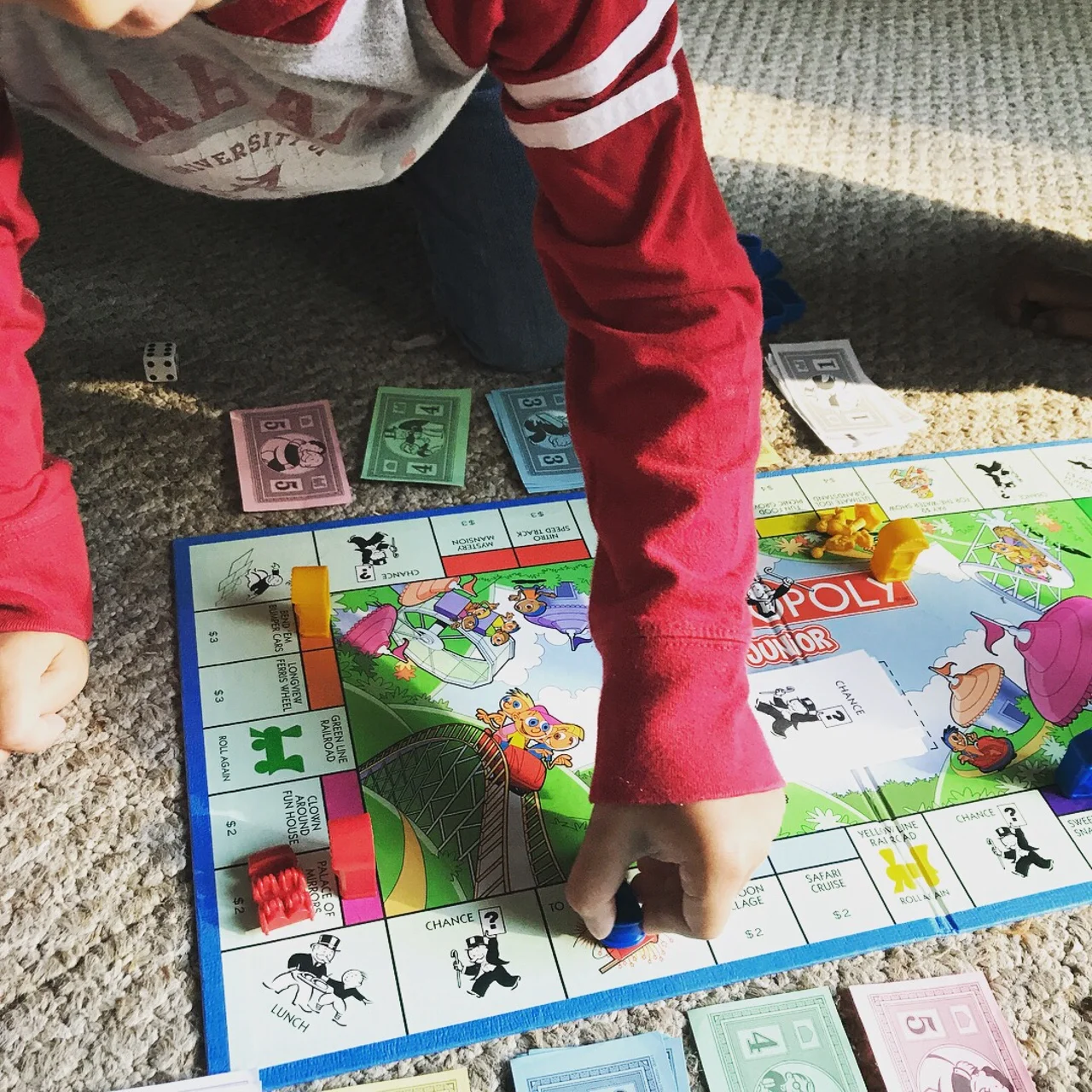 Yesterday I said to the kids, "Let's play a game." "Yay! Let's Play Monopoly!"- this from my four-year-old. He's been really interested in Monopoly Junior lately. I love to play games with my kids, you guys, but oh, man, this one is not my favorite to play with littles. First of all, it takes forever- almost like regular Monopoly, so one game can seem to drag on for hours. It's like going down the rabbit hole! For another thing, even though he's getting pretty good at it, it's really NOT geared toward kids his age. Which can make it hard (and even harder if we're playing with more than one kiddo, like when we play with his five-year-old cousin), because it sometimes requires skills that he hasn't quite developed yet. So, why do I keep playing this game with him? Read on!