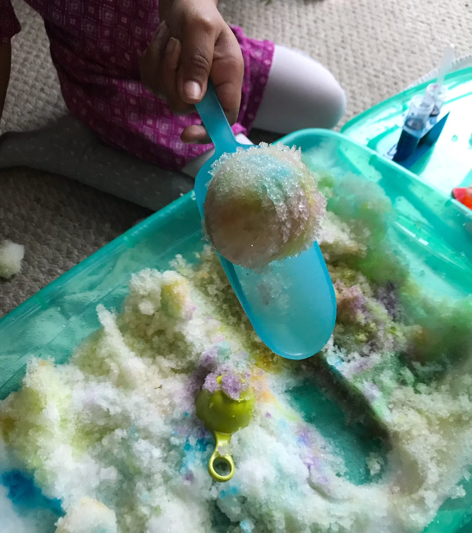 Obviously, this one is going to be dependent on your weather, but I'll tell you what: sometimes when you can't go OUT to play in the snow, bringing it in is the next best thing. And it makes for a super easy sensory bin. We just scooped up a bunch of snow and threw it in one of our containers. I gave the kids some scoops and measuring cups, as well as some pipettes and some colored water. They spent a good 45 minutes coloring, scooping, and building things out of the snow.